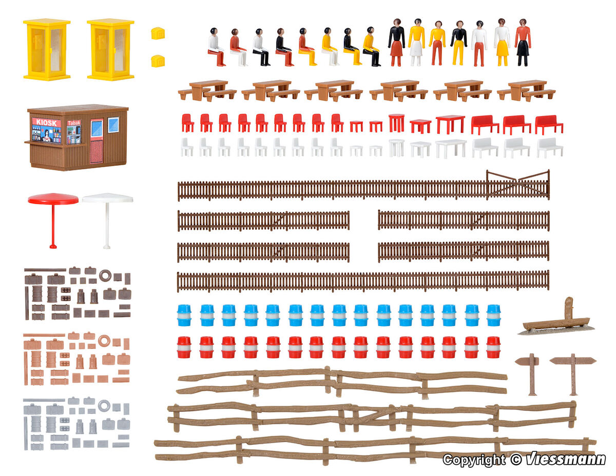 Bausatz. Umfangreiches Dekorationsmaterial mit Figuren, Zaunelementen, Sitzgruppen, Gepäck, Benzinfässern, Wegweisern, Telefonzellen und Kiosk.