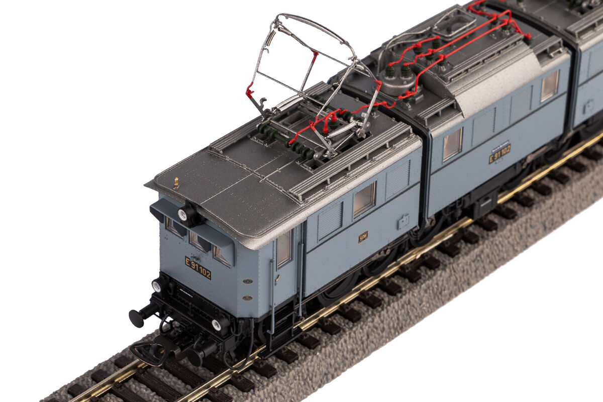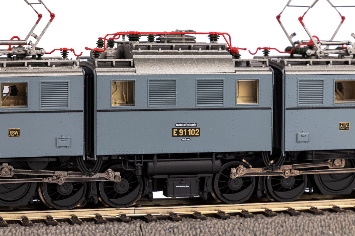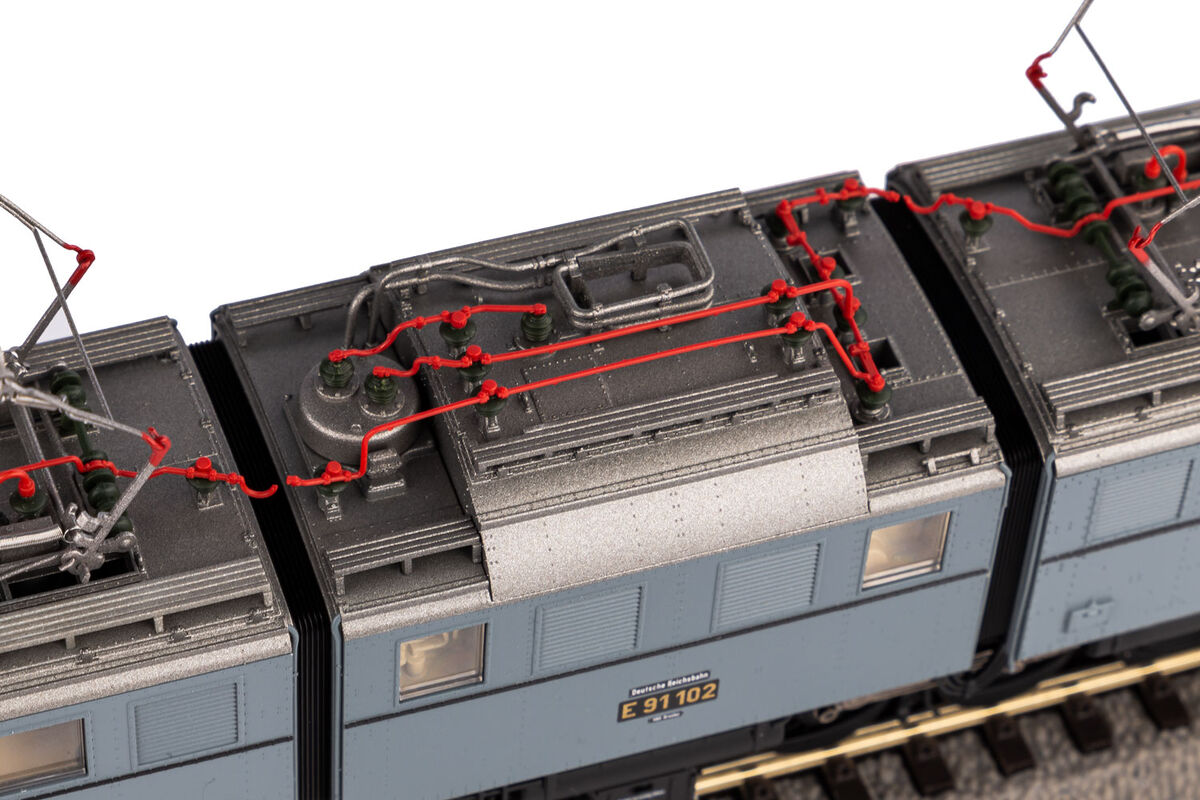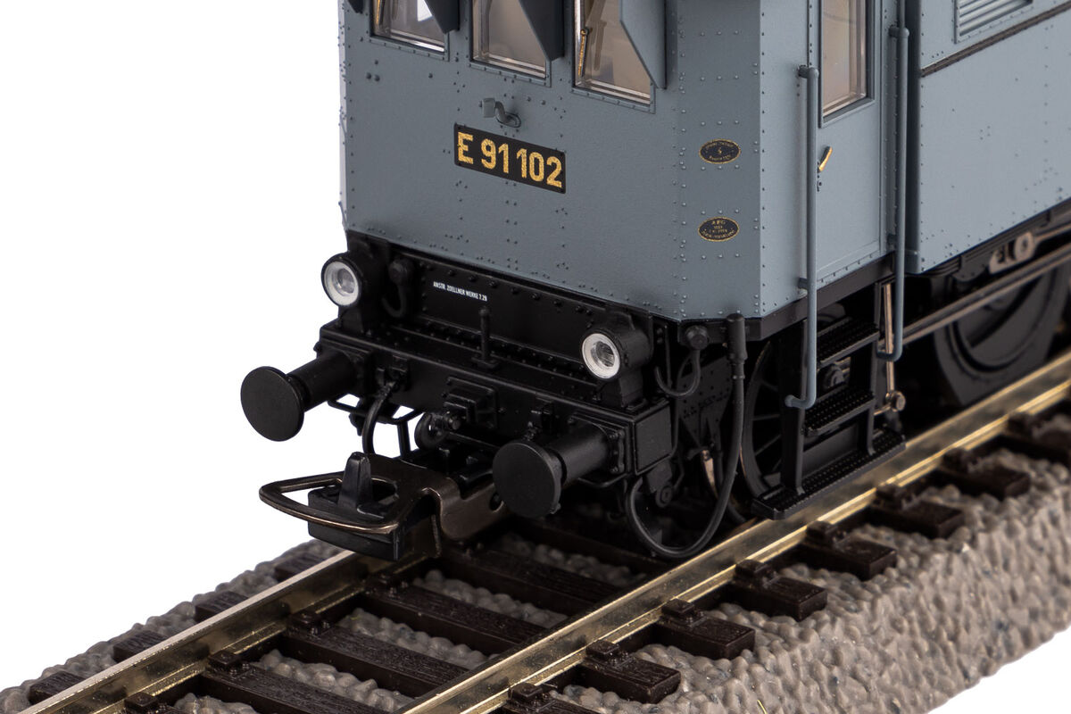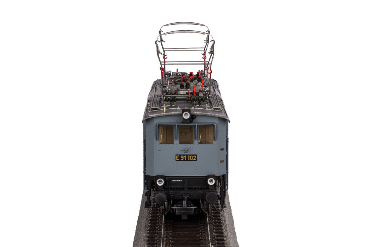 Neuheit 2022: Variante der BR 191 als BR E 91 der DRG in Epoche II. Elektroloks mit Stangenantrieben zählen zu den Glanzlichtern auf der Modellbahnanlage. Das oft archaische Äußere und die sichtbare Kraftübertragung strahlen die Faszination vergangener Eisenbahnepochen aus. Diese hat PIKO perfekt eingefangen und in den Maßstab 1:87 transferiert. Die konstruktive Symbiose aus hervorragender Modellumsetzung und ausgezeichneten Fahreigenschaften zeichnen den Charakter der neuentwickelten PIKO E 91. Die scharfen Gravuren des Gehäuses, gepaart mit einer hochfeinen Bedruckung und garniert mit äußerst filigranen Stromabnehmern machen die Lok zu einem Schmuckstück. Kraft schöpft sie aus einem fünfpoligen PIKO Motor, zwei fein gewuchtete Schwungmassen sorgen auch bei schwieriger Gleislage für kontinuierliche Fahrt. Selbstverständlich verfügt das Modell über einen Lichtwechsel in LED-Technik mit roter Schlussbeleuchtung. Zusätzliche Beleuchtungsfunktionen können durch Nachrüstung eines Digitaldecoders geschaltet werden, für den einfachen Einbau steht eine PluX22-Schnittstelle nach NEM 658 zur Verfügung.
