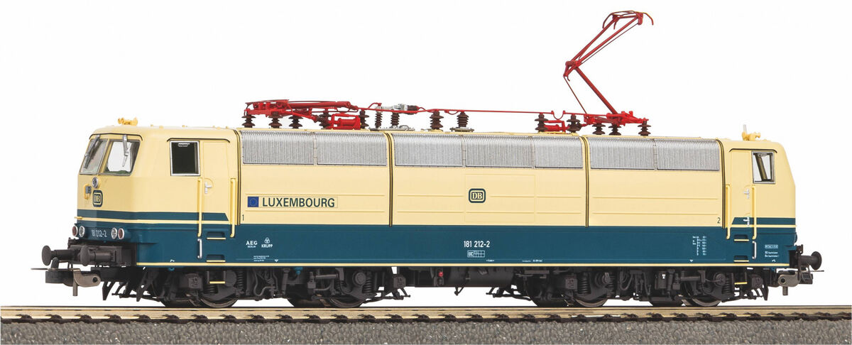 Neuheit 2024: Variante der BR 181.2 der DB mit Bedruckung Luxembourg in Epoche IV. Das PIKO Modell der wichtigen Mehrsystem-Lokbaureihe 181.2 zeigt alle relevanten Details seines Vorbildes auf und überzeugt durch feinste Lackierung und Bedruckung, erhabene Namensschilder auf den Seiten, extra angesetzte Frontgriffe und Türgriffstangen, scharf gravierte Drehgestellblenden, feine Isolatoren und Stromabnehmer mit unterschiedlichen Schleifstücken. Die Beleuchtung erfolgt mittels LEDs. Die serienmäßig eingebaute Führerstands- und Maschinenraumbeleuchtungen sind hierbei wie die fahrtrichtungsabhängig funktionierenden Schlusslichter mit PluX22 Decoder digital schaltbar. Ein starker fünfpoliger Motor mit Schwungmassen, der alle vier Achsen antreibt, sorgt für hervorragende Fahreigenschaften. Das schwere PIKO Modell verfügt über zwei Haftreifen und einen schweren Zinkdruckgussrahmen für große Zugkräfte. Die PIKO 181.2 besitzt ab Werk einen passenden PSD XP Sound-Decoder mit größtmöglichem Lautsprecher.