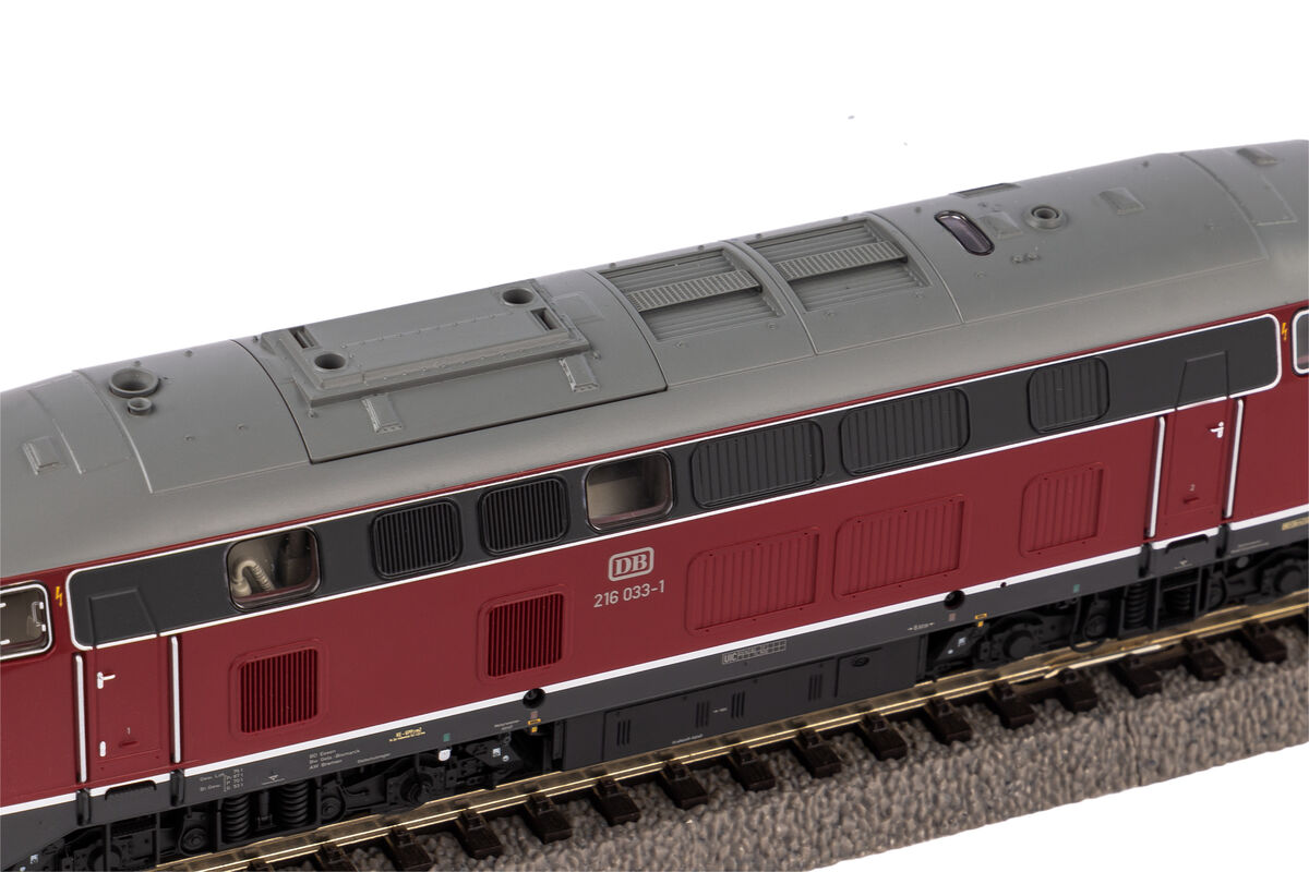 Neuheit 2022: Variante der BR 216 in der Ausführung der DB in Epoche IV. Die Baureihe V 160 bzw. 216 war in den 1960er- und 1970er-Jahren bei der Bundesbahn die Eilzuglok für Strecken ohne Fahrdraht. Die Neukonstruktion dieses wichtigen Fahrzeugtyps schließt nicht nur im Sortiment von PIKO eine Lücke, sondern wird durch zahlreiche Varianten viele Modellbahnanlagen der Epochen III bis V bereichern. Das Entwicklerteam hat die markante Formgebung des Vorbilds in herausragender Qualität im Modell umgesetzt und dabei gleichzeitig ideale Fahreigenschaften erzielt. Diese Attribute werden durch den wirkungsvollen Einsatz perfekter Gravuren und einer bis ins kleinste Detail stimmigen Lackierung unterstrichen. Zeitgemäße LED-Technik dient als Basis für den Lichtwechsel in Rot/Weiß sowie die durch Nachrüstung eines Digitaldecoders schaltbaren Lichtfunktionen. Auf aktuellstem Stand der Technik ist die Digitalschnittstelle PluX22 nach NEM 658, ein Decoder kann ganz einfach aufgesteckt werden. Mit beigelegten Zurüstteilen lässt sich die Pufferbohle des Fahrzeugs vorbildgerecht vervollständigen.
