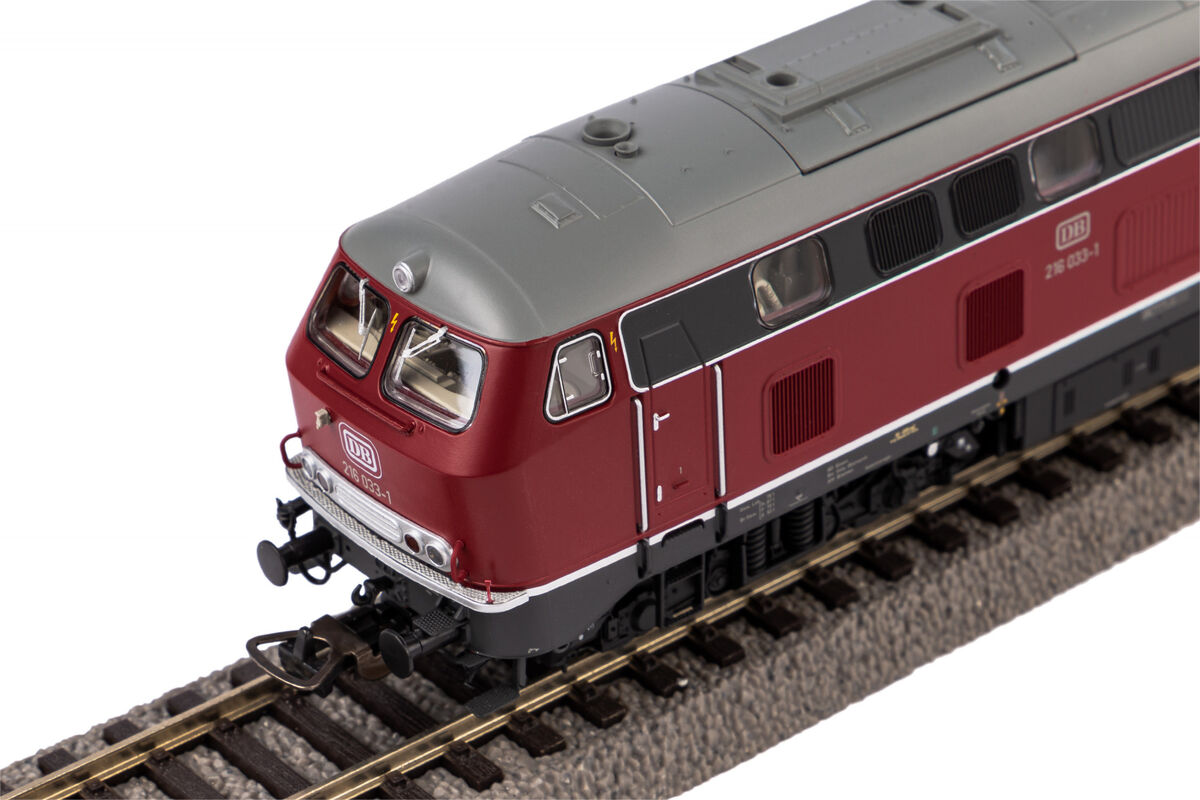 Neuheit 2022: Variante der BR 216 in der Ausführung der DB in Epoche IV. Die Baureihe V 160 bzw. 216 war in den 1960er- und 1970er-Jahren bei der Bundesbahn die Eilzuglok für Strecken ohne Fahrdraht. Die Neukonstruktion dieses wichtigen Fahrzeugtyps schließt nicht nur im Sortiment von PIKO eine Lücke, sondern wird durch zahlreiche Varianten viele Modellbahnanlagen der Epochen III bis V bereichern. Das Entwicklerteam hat die markante Formgebung des Vorbilds in herausragender Qualität im Modell umgesetzt und dabei gleichzeitig ideale Fahreigenschaften erzielt. Diese Attribute werden durch den wirkungsvollen Einsatz perfekter Gravuren und einer bis ins kleinste Detail stimmigen Lackierung unterstrichen. Zeitgemäße LED-Technik dient als Basis für den Lichtwechsel in Rot/Weiß sowie die durch Nachrüstung eines Digitaldecoders schaltbaren Lichtfunktionen. Auf aktuellstem Stand der Technik ist die Digitalschnittstelle PluX22 nach NEM 658, ein Decoder kann ganz einfach aufgesteckt werden. Mit beigelegten Zurüstteilen lässt sich die Pufferbohle des Fahrzeugs vorbildgerecht vervollständigen.