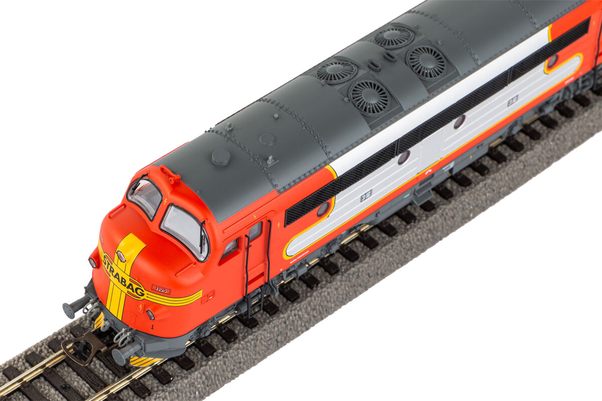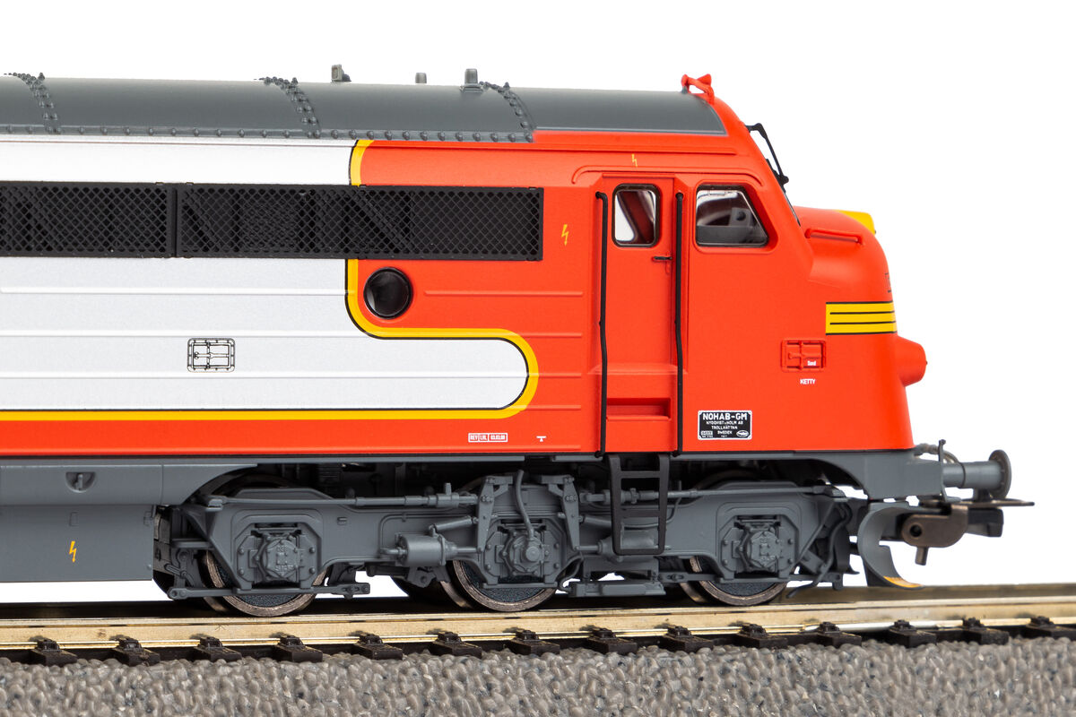 Neuheit 2023: Variante der Diesellokomotive NoHAB als My 1125 im Design Santa Fe der STRABAG in Epoche V. Zu den markantesten Dieselloks auf europäischen Gleisen zählt zweifelsohne die „NoHAB“. Dabei handelt es sich um einen Ableger der legendären F-Reihe des USHerstellers EMD, der ab 1954 beim schwedischen Lizenznehmer Nydqvist och Holm AB, kurz „NoHAB“, gebaut wurde. Durch die Liberalisierung des europäischen Schienenverkehrsmarktes fanden zahlreiche Loks neue Arbeitsfelder bei privaten Unternehmen auch in Deutschland und sind teils noch heute im kommerziellen Einsatz. Über Geschmack lässt sich trefflich streiten, es gibt jedoch Dinge, deren Eleganz über jeden Zweifel erhaben ist. Von der unbestrittenen Eleganz des Vorbilds dürfen auch die PIKO Modelle der NoHAB profitieren. Um diesen Gesamteindruck zu erreichen wurde großer Wert auf Details gelegt. Die seitlichen Lüftungsgitter werden als stark gliedernde Elemente des Lokkastens mit feinen Ätzteilen ausgeführt und sind ein absoluter Blickfang. Aber auch die markanten stirnseitigen Scheiben sowie die seitlichen „Bullaugen“ tragen durch den perfekt bündigen Sitz zum hervorragenden Bild bei. Vollendet wird der Eindruck durch die präzise und hochdetaillierte Gestaltung der Drehgestelle. Als Antrieb dient ein kräftiger und laufruhiger Motor mit zwei Schwungmassen. Verschiedene Beleuchtungsfunktionen und der kernige Klang der Soundversionen sorgen für abwechslungsreichen Betrieb auf der Anlage.