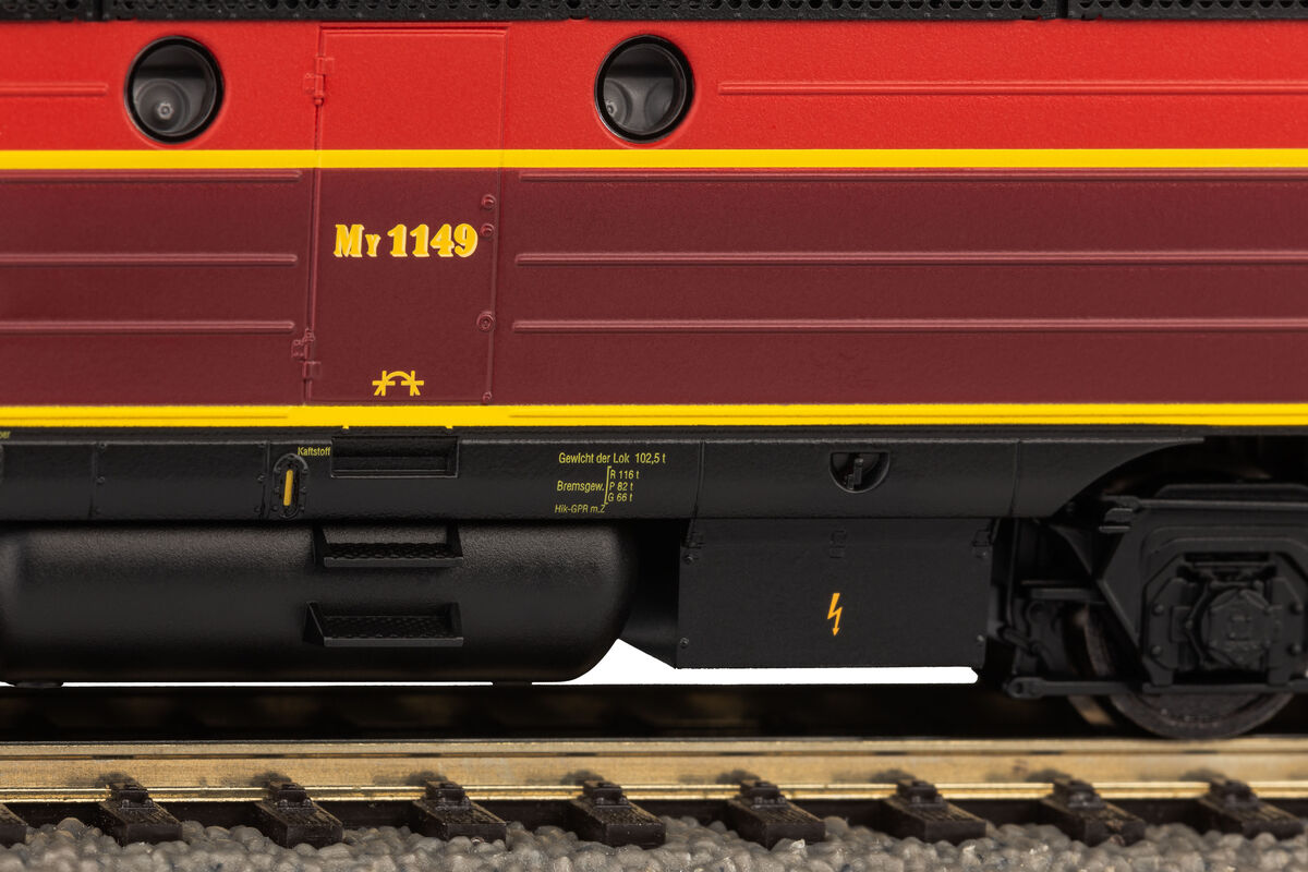 Neuheit 2024: Die PIKO "Rundnase" in attraktiver Bedruckung der 1149 von Altmark-Rail in Epoche VI. Über Geschmack lässt sich trefflich streiten, es gibt jedoch Dinge, deren Eleganz über jeden Zweifel erhaben ist. Von der unbestrittenen Eleganz des Vorbilds dürfen auch die PIKO Modelle der NoHAB profitieren. Um diesen Gesamteindruck zu erreichen wurde großer Wert auf Details gelegt. Die seitlichen Lüftungsgitter werden als stark gliedernde Elemente des Lokkastens mit feinen Ätzteilen ausgeführt und sind ein absoluter Blickfang. Aber auch die markanten stirnseitigen Scheiben sowie die seitlichen „Bullaugen“ tragen durch den perfekt bündigen Sitz zum hervorragenden Bild bei. Vollendet wird der Eindruck durch die präzise und hochdetaillierte Gestaltung der Drehgestelle. Als Antrieb dient ein kräftiger und laufruhiger Motor mit zwei Schwungmassen. Das Modell ist dank PluX22-Schnittstelle und ausreichend Platz auf der aufgeräumten Platine für die einfache Nachrüstung eines Decoders und Sound vorbereitet.