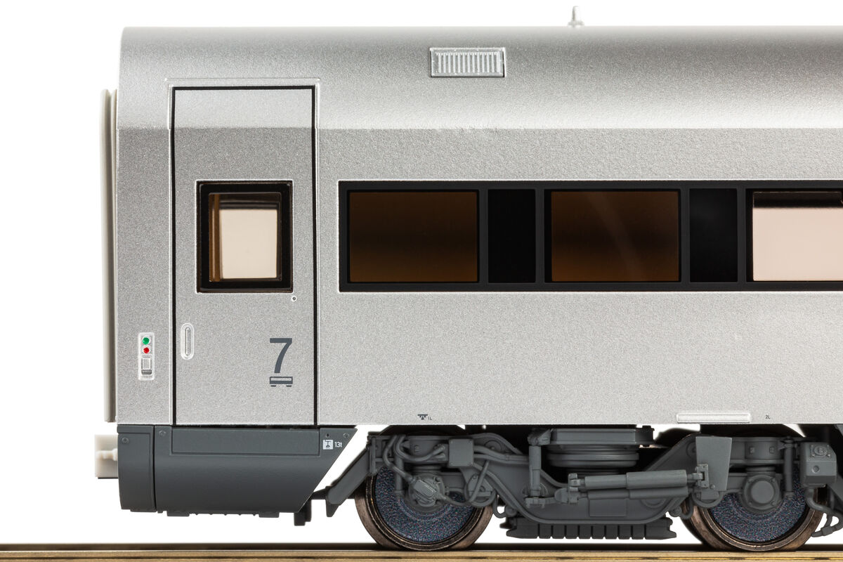 Von außen überzeugen die Modelle durch ihr elegant anmutendes Erscheinungsbild, welches dem des Vorbildes in nichts nachsteht. Durch die perfekt bündig eingesetzten, glasklaren Fenster fällt der Blick in den Innenraum. Alle Wagen verfügen über eine individuelle, passend abgestimmte Inneneinrichtung. Ein weiteres Highlight sind die scharf gravierten Drehgestelle und die detailliert nachgebildeten Wagenböden. Plastisch anmutende Gravuren sowie eine vorbildgerechte Lackierung mit konturenscharfen Beschriftungen runden den äußeren Eindruck perfekt ab. Auf der Anlage befördert die kraftvolle BR 101 die Wagengarnitur seidenweich über die Gleise. Alle Wagen verfügen zudem über eine stimmige indirekte Innenbeleuchtung, um ein harmonisches Ambiente zu schaffen. Für vorbildgerechten Betrieb auf der Anlage verfügt das Modell ab Werk über einen passenden PSD XP Sound-Decoder.Das vierteilige Zugset besteht aus einer Schnellzuglokomotive Baureihe 101, einem Schnellzugwagen Apmz 116.0 Ordnungsnummer 1, einem Schnellzugwagen Apmkz 116.6 Ordnungsnummer 3 und einem Schnellzug-Steuerwagen Apmbzf 116.8 Ordnungsnummer 7.
