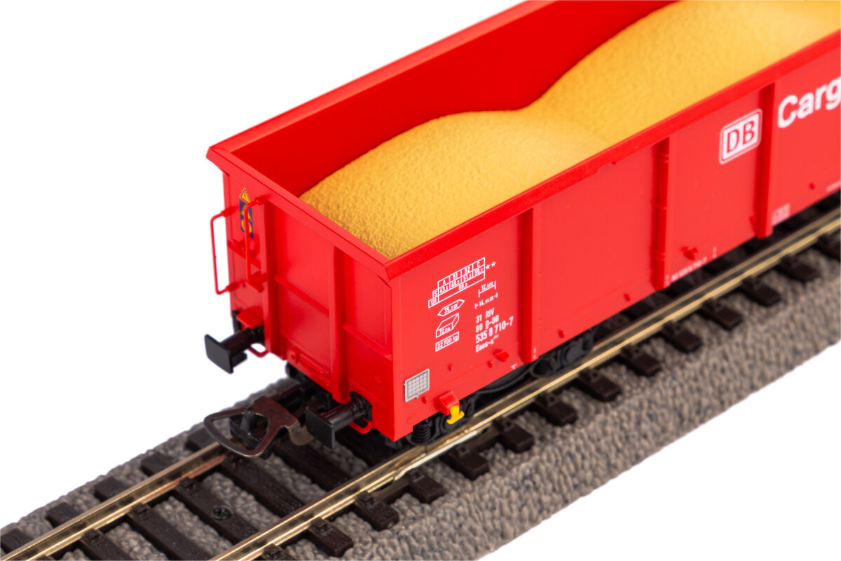 Neuheit 2022: Zweierset bestehend aus zwei offenen Güterwagen vom Typ Eaos der DB AG aus Epoche V mit Sandbeladung. Wie das Vorbild ist der Eaos auch im Modell ein Fahrzeug mit hoher Verbreitung und sollte auf jeder Modellbahnanlage a mehrmals vorhanden sein. Da lag es nahe, diesen wichtigen Wagentyp mit einer zeitgemäßen Neukonstruktion zu bedenken. Entstanden ist eine Miniatur, die dank äußerst plastischer Gravuren und einer vollendeten Lackierung samt stimmiger Bedruckung absolut authentisch wirkt. Besonders ins Auge fallen die äußerst fein gearbeiteten Drehgestelle, deren Konstruktion gleichzeitig eine perfekte Gleislage gewährleistet. Für ein vorbildorientiertes Bild im Zugverband sorgt die Kulissenführung. Radsätze für das Mittelleiter-System stehen zur Verfügung. Set zweier typischer offener Güterwagen vom Typ Eaos, in den klassischen Farben und Anschriften von DB Cargo. Zur Reduktion von Wartungskosten und bedingt durch maschinelle Entladung wurden bei vielen Eaos Wagen einseitig die Türen ausgebaut und die Öffnung mit Blechen verschlossen. Diesen Zustand gibt das PIKO Modell vorbildgerecht wieder.