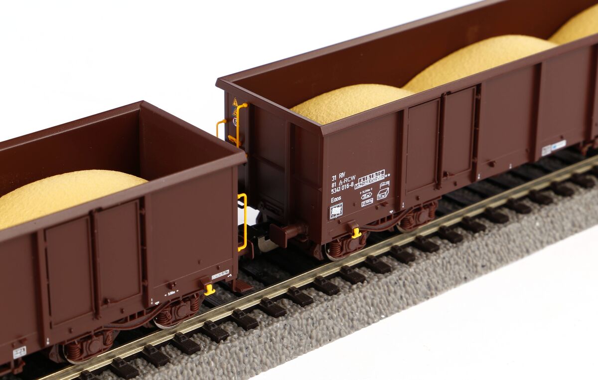 Neuheit 2022: Zweierset bestehend aus zwei offenen Güterwagen vom Typ Eaos der RCW aus Epoche VI mit Sandbeladung. Wie das Vorbild ist der Eaos auch im Modell ein Fahrzeug mit hoher Verbreitung und sollte auf jeder Modellbahnanlage mehrmals vorhanden sein. Da lag es nahe, diesen wichtigen Wagentyp mit einer zeitgemäßen Neukonstruktion zu bedenken. Entstanden ist eine Miniatur, die dank äußerst plastischer Gravuren und einer vollendeten Lackierung samt stimmiger Bedruckung absolut authentisch wirkt. Besonders ins Auge fallen die äußerst fein gearbeiteten Drehgestelle, deren Konstruktion gleichzeitig eine perfekte Gleislage gewährleistet. Für ein vorbildorientiertes Bild im Zugverband sorgt die Kulissenführung. Radsätze für das Mittelleiter-System stehen zur Verfügung. Dieses Wagenpaar verfügt über die passenden Farben und Beschriftungen der typischen Eaos Wagen der ÖBB. Eine Besonderheit dieser offenen Güterwagen sind die rechteckigen Puffer und die Sandladung .