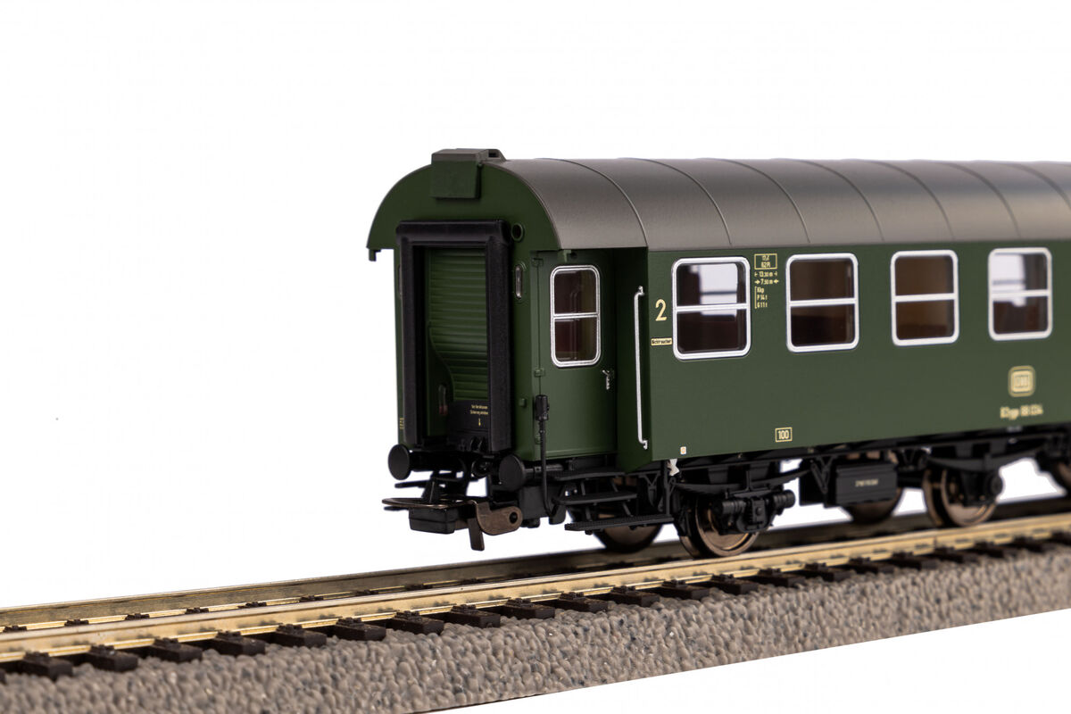 Neuheit 2023: Zweierset der kurzgekuppelten Umbauwagen mit zwei 2. Klasse Wagen der DB in Epoche IV. Anders als beim Vorbild wurde für die PIKO Modelle der dreiachsigen Umbauwagen nicht auf vorhandene Teile zurückgegriffen, sondern ein Expert-Modell komplett neu konstruiert. Die maßstäblichen Fahrzeuge geben das Original bis ins kleinste Detail exakt wieder. Einzeln angesetzte Griffstangen gehören genauso zur zeitgemäßen Konstruktion wie bündig abschließende, glasklare Fenster und eine detaillierte Inneneinrichtung. Die liebevolle Gestaltung setzt sich auch am Wagenboden fort. Er überzeugt durch freistehende Leitungen, ein filigranes Bremsgestänge sowie Rangiergriffe und Fangeisen aus Metall. Wie das Vorbild kommen die PIKO Umbauwagen als kurzgekuppelte Pärchen in den Handel und verfügen, dank der präzise geführten Kurzkupplungskinematik, über einen vorbildnahen Abstand zwischen den Wagen. Abgerundet werden die Wagen durch die optional erhältliche Innenbeleuchtung.