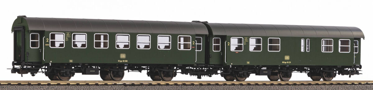 Neuheit 2023: Zweierset der kurzgekuppelten Umbauwagen mit einem 2. Klasse Wagen und einem 2. Klasse Wagen mit Gepäckabteil der DB in Epoche IV. Anders als beim Vorbild wurde für die PIKO Modelle der dreiachsigen Umbauwagen nicht auf vorhandene Teile zurückgegriffen, sondern ein Expert-Modell komplett neu konstruiert. Die maßstäblichen Fahrzeuge geben das Original bis ins kleinste Detail exakt wieder. Einzeln angesetzte Griffstangen gehören genauso zur zeitgemäßen Konstruktion wie bündig abschließende, glasklare Fenster und eine detaillierte Inneneinrichtung. Die liebevolle Gestaltung setzt sich auch am Wagenboden fort. Er überzeugt durch freistehende Leitungen, ein filigranes Bremsgestänge sowie Rangiergriffe und Fangeisen aus Metall. Wie das Vorbild kommen die PIKO Umbauwagen als kurzgekuppelte Pärchen in den Handel und verfügen, dank der präzise geführten Kurzkupplungskinematik, über einen vorbildnahen Abstand zwischen den Wagen. Abgerundet werden die Wagen durch die optional erhältliche Innenbeleuchtung.