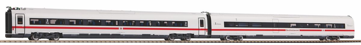 2er Set Ergänzungswagen zum PIKO ICE 4 der DB AG Ep. VI. Die Deutsche Bahn AG beauftragte 2011 Siemens Mobility mit dem Bau von bis zu 300 neuen Hochgeschwindigkeitszügen für den Einsatz in Deutschland, Österreich und der Schweiz. Die neuen Triebzüge der BR 412/812, die gemeinsam von Siemens und Bombardier entwickelt werden, werden über mehrere Wagen, sogenannte Powercars, angetrieben. Die Zugkonfiguration sieht hierbei verschiedene modular aufgebaute Einheiten von fünfteiligen bis zu 14teiligen Zügen vor. Durch dieses Konzept kann der Zug problemlos an die individuellen Vorgaben der Verkehrsunternehmen bei der gewünschten Beschleunigung, Geschwindigkeit und Zahl der Sitzplätze angepasst werden. Die DB hat bisher als Basiskonfiguration85 zwölf- und 45 siebenteilige Triebzüge bestellt, die aus antriebslosen End- bzw. Steuerwagen, angetriebenen Sitzwagen und Bordbistro sowie nichtangetriebenen Sitz-, Speise- und Servicewagen bestehen.Der siebenteilige Triebzug besitzt drei angetriebenen Wagen und bietet 456 Sitzplätze auf einer Länge von 200 Metern. Ein zwölfteiliger Triebzug verfügt über sechs angetriebene Wagen und 830 Sitzplätze auf einer Länge von 346 Metern. Die Höchstgeschwindigkeit beträgt mit 250 km/h. Die äußere Form wurde an die bestehende ICE-Flotte angelehnt und weiterentwickelt. Seit Dezember 2017 werden die ersten Züge im Regelbetrieb auf den Linien Hamburg–Würzburg, Stuttgart–München und Hamburg–Berlin–München eingesetzt.