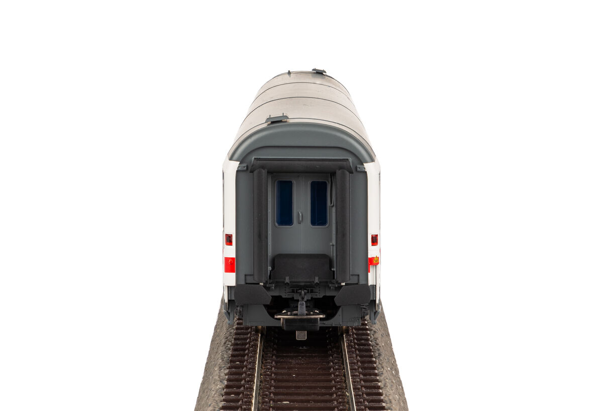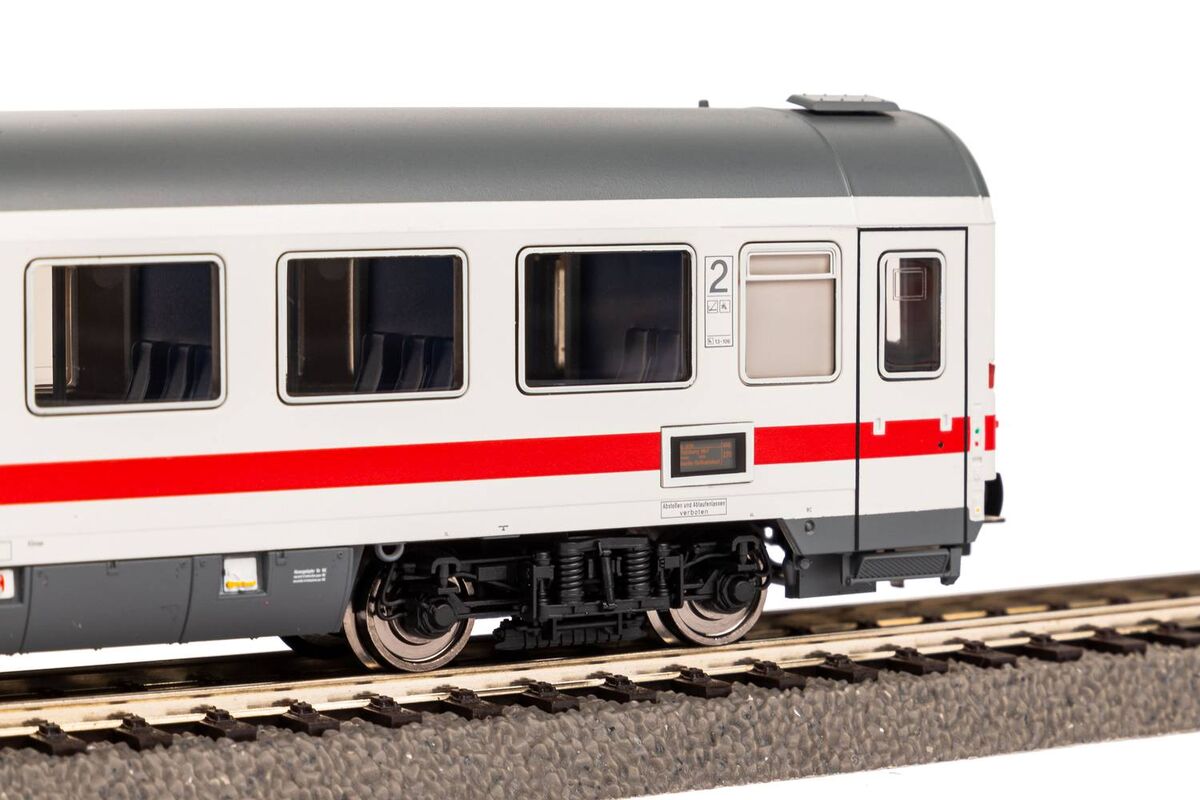 Neuheit 2023: Nach 40 Jahren IC-Verbindungen in Deutschland zeigte sich der Wagenpark bunt durchmischt. Mit dem Projekt „IC mod.“ wollte die DB AG diesem Zustand ein Ende setzen und ließ ab 2009 einige Musterumbauten durchführen. Ab dem Jahr 2012 begann der Serienumbau in den Ausbesserungswerken Kassel, Neumünster und Nürnberg, wobei die Wagen eine neue Inneneinrichtung nach ICE-Standard, neue Türen, Klimaanlage und Verkabelung erhielten.Im Gegensatz zum Vorbild setzt PIKO auf eine komplette Neukonstruktion für die modernisierten IC-Wagen. Die Fahrzeuge wurden präzise im Maßstab 1:87 umgesetzt und bestechen mit feinsten Gravuren und bündig eingesetzten Fenstern. Die Inneneinrichtung ist hochdetailliert wiedergegeben und steht dem Vorbild in nichts nach. Auch die Drehgestellte überzeugen mit vielen Details, wie zum Beispeil einzeln angesetzten Federpaketen, Magnetbremsen oder Bremsscheibennachbildungen auf den Achsen. Auch ein Blick unter den Wagen lohnt sich. Maschinenanlagen, Batteriefächer und alle Versorgungsleitungen wurden mit viel Liebe zum Detail nachgebildet. Der zweite Klasse Wagen ist natürlich für die unkomplizierte Nachrüstung einer Innenraumbeleuchtung vorbereitet.
