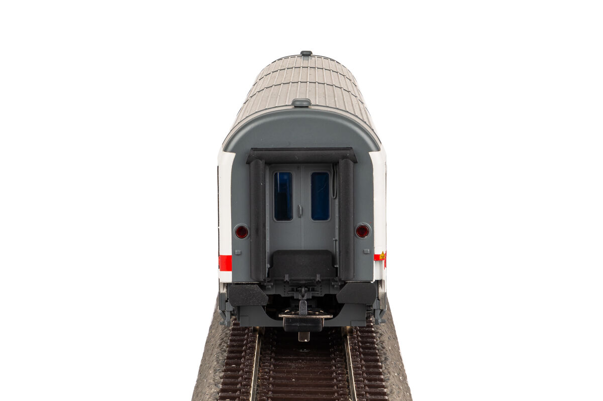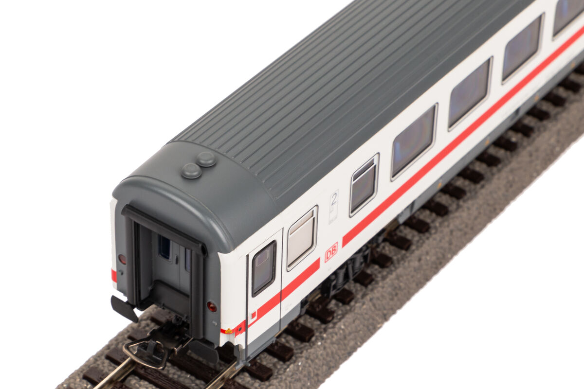 Neuheit 2023: Nach 40 Jahren IC-Verbindungen in Deutschland zeigte sich der Wagenpark bunt durchmischt. Mit dem Projekt „IC mod.“ wollte die DB AG diesem Zustand ein Ende setzen und ließ ab 2009 einige Musterumbauten durchführen. Ab dem Jahr 2012 begann der Serienumbau in den Ausbesserungswerken Kassel, Neumünster und Nürnberg, wobei die Wagen eine neue Inneneinrichtung nach ICE-Standard, neue Türen, Klimaanlage und Verkabelung erhielten.Im Gegensatz zum Vorbild setzt PIKO auf eine komplette Neukonstruktion für die modernisierten IC-Wagen. Die Fahrzeuge wurden präzise im Maßstab 1:87 umgesetzt und bestechen mit feinsten Gravuren und bündig eingesetzten Fenstern. Die Inneneinrichtung ist hochdetailliert wiedergegeben und steht dem Vorbild in nichts nach. Auch die Drehgestellte überzeugen mit vielen Details, wie zum Beispeil einzeln angesetzten Federpaketen, Magnetbremsen oder Bremsscheibennachbildungen auf den Achsen. Auch ein Blick unter den Wagen lohnt sich. Maschinenanlagen, Batteriefächer und alle Versorgungsleitungen wurden mit viel Liebe zum Detail nachgebildet. Der zweite Klasse Wagen ist natürlich für die unkomplizierte Nachrüstung einer Innenraumbeleuchtung vorbereitet.
