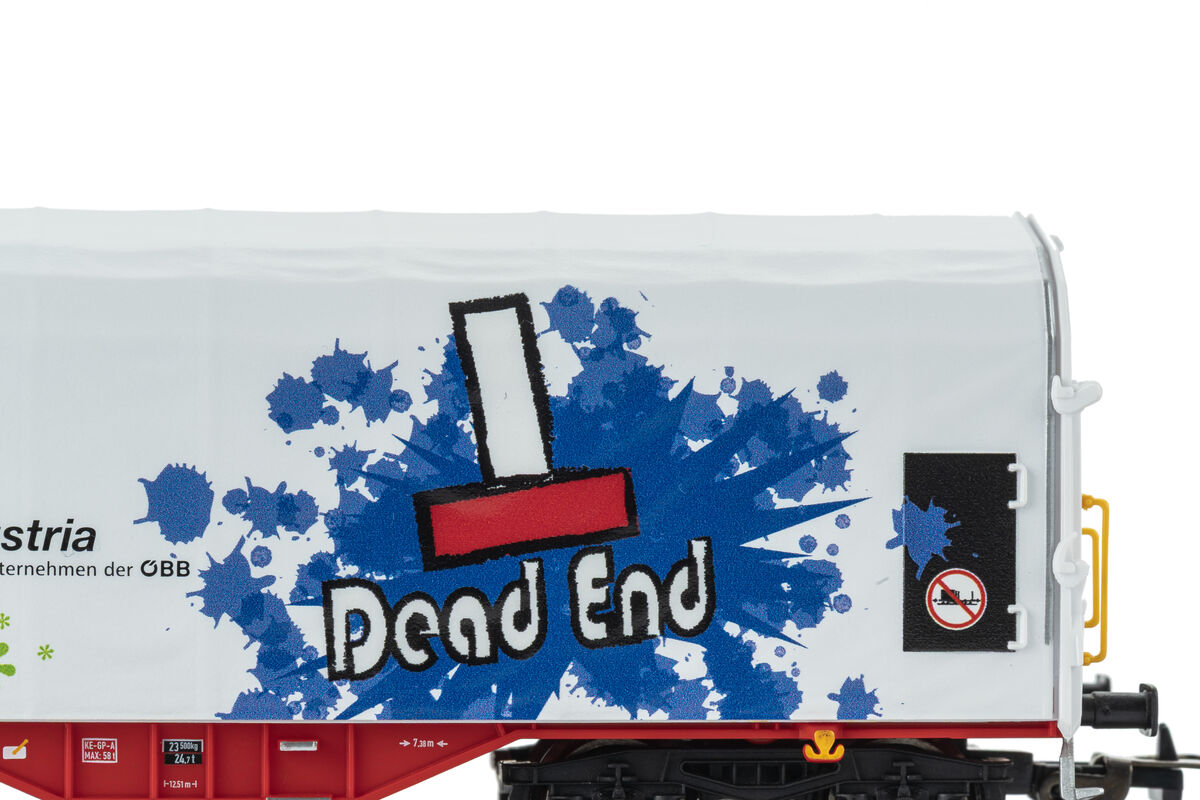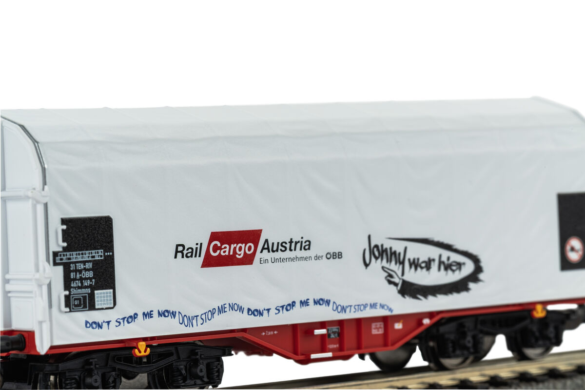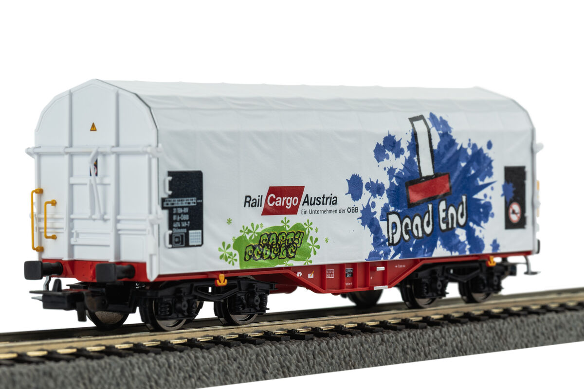 Neuheit 2021: Schiebeplanwagen der Rail Cargo Austria in der Epoche VI. Die Seiten des Wagens sind mit unterschiedlichen Dekors bedruckt.