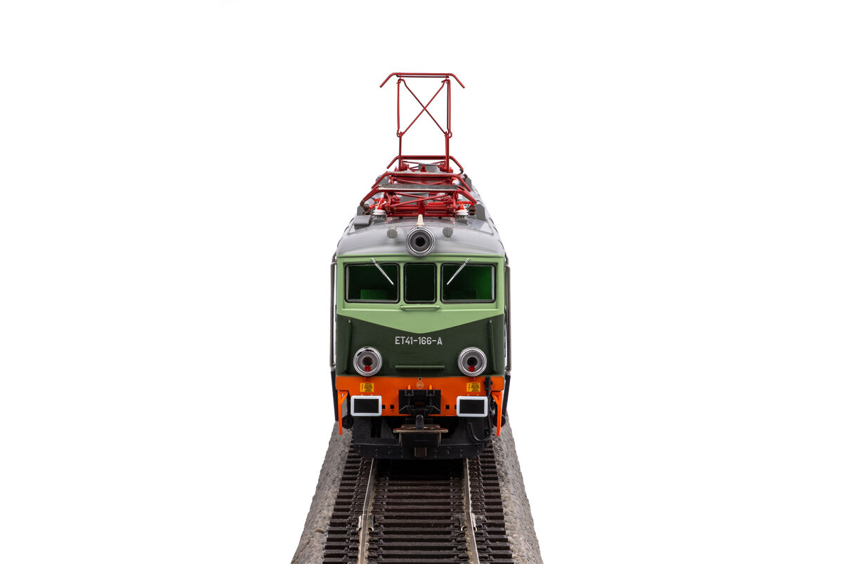 Neuheit 2023: Druckvariante der ET41 PKP im Design der Epoche IV. Die PIKO ET 41 verkörpert, wie das große Vorbild, eine übersichtliche, funktionssichere und wartungsarme Konstruktion. Als Doppellokomotive besteht das PIKO Modell aus einem Fahrzeugsegment mit Antrieb und einem antriebslosen Segment. Dank des kräftigen, mit zwei präzise ausgewuchteten Schwungmassen versehenen Motors und der Kardanwellenantriebe auf die beiden je zweiachsigen Drehgestelle besitzt die PIKO ET 41 sehr ausgeglichene Laufeigenschaften. Das hohe Eigengewicht sorgt im Zusammenwirken mit der diagonalen Haftbereifung der innen laufenden Achsen der angetriebenen Drehgestelle für vorbildgerecht hohe Zugkräfte. Da auch die vier Achsen des antriebslosen Segments zur Stromabnahme dienen und beide Segmente über eine stromführende Kurzkupplung verbunden sind, verfügt das Modell über eine außergewöhnlich sichere Stromabnahme über insgesamt 16 Räder. Das Modell besitzt ab Werk einen PIKO Sound-Decoder mit passendem Lautsprecher. Als Besonderheit ist die Umschaltung auf Oberleitungsbetrieb möglich.
