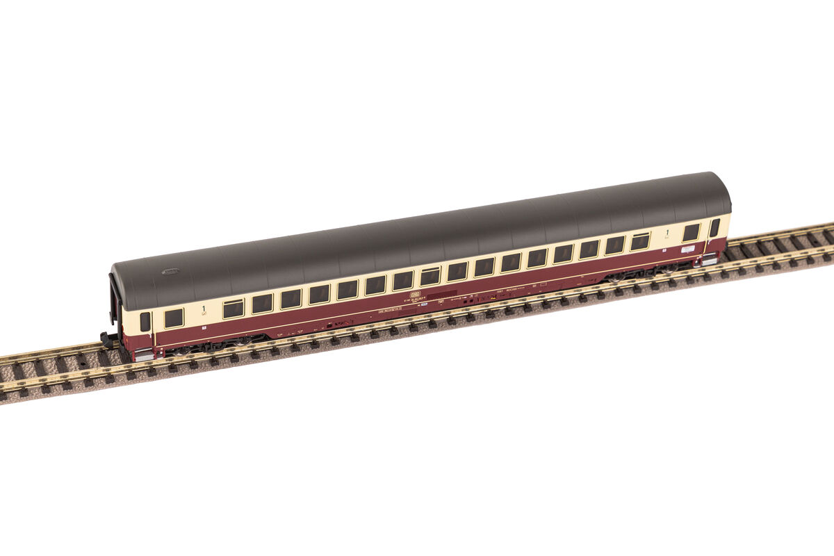 Neuheit 2023: Die IC Wagen der DB als komplette Neukonstruktion von PIKO im Maßstab 1:160. Das wegweisende Konzept des IC `79 wurde zu Beginn des Sommerfahrplans 1979 von der Bundesbahn mit dem bekannten Slogan „Jede Stunde, jede Klasse“ eingeführt. Dieser neue Weg wurde erforderlich, da die rein erstklassigen Intercitys zu diesem Zeitpunkt durch den anhaltenden Fahrgastschwund kaum noch wirtschaftlich zu betreiben waren. Mit der Einführung der zweiten Wagenklasse wurde gleichzeitig der Takt auf einen Stundenrhythmus angehoben. Angestrebte Verkürzungen der Reisezeiten erfolgten durch den Ausbau vieler Strecken und die Anhebung der Höchstgeschwindigkeiten. Diese beschleunigten Züge führten zur weiteren Zeitersparnis keine Gepäck- und Postwagen mehr und waren für ein schnelles Umsteigen in den Knotenbahnhöfen in die Blöcke 1. Klasse, Speisewagen und 2. Klasse unterteilt. Nach dem Erfolg des Konzeptes wurde 1985 das IC-Netz von vier auf fünf Linien erweitert. Bis heute stellt der IC ein wichtiges Rückgrat im Fernverkehr der Bahn dar.
