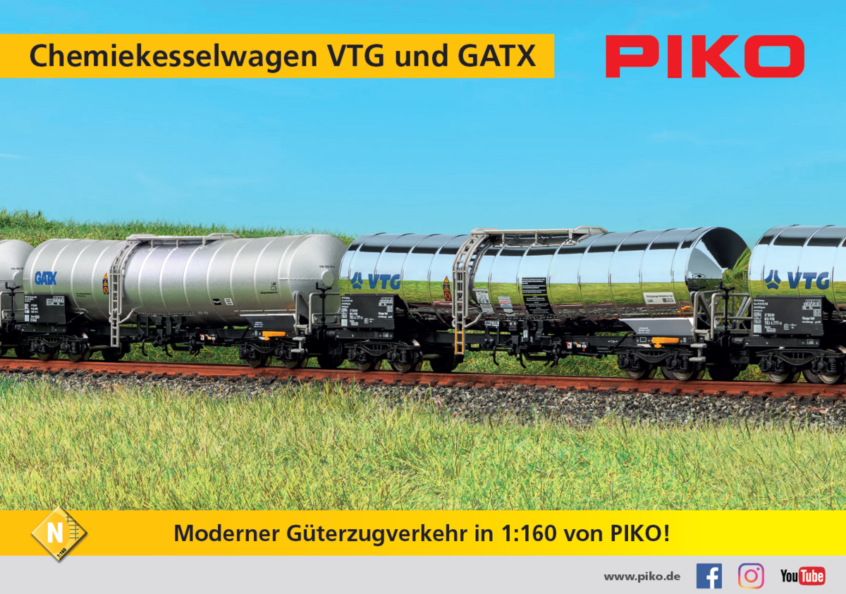 Neuheit 2025: Für den Transport von Chemikalien unterschiedlichster Art, ist der mit einem Kessel aus Chromnickelstahl (V4A) ausgestattete Wagen ein unverzichtbares und modernes Transportmittel für viele Betriebe. Diese Wagen sind, einerseits durch Isolierung, andererseits durch eine Heizung, für den Transport verschiedenster Stoffe konzipiert. Das PIKO Modell dieses modernen, vierachsigen Chemiekesselwagens überzeugt durch seine hohe Detaillierung im Maßstab 1:160! Ob feine Leitern, freistehende Griffstangen und Geländer oder der detailliert ausgeführte Wagenboden - das PIKO Modell lädt zum Staunen ein. Abgerundet wird der Gesamteindruck durch den Kessel mit konturenscharfer Bedruckung im Design eines GATX Wagens.Dieser Fahrzeugtyp ist nicht nur als Einzelfahrzeug in jedem gemischten Güterzug ein Blickfang, sondern lässt auch die Bildung attraktiver Ganzzüge zu.