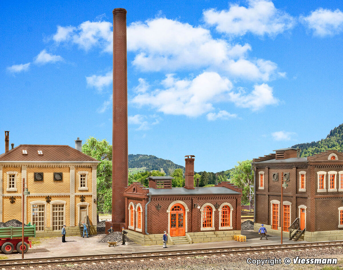 Das kompakte Heizwerk ist ein Gebäude aus der Gründerzeit. Mit den dazugehörigen Schornsteinen findet es auf kleinster Fläche Platz. Maße: L 13 x B 12 x H 30 cm.