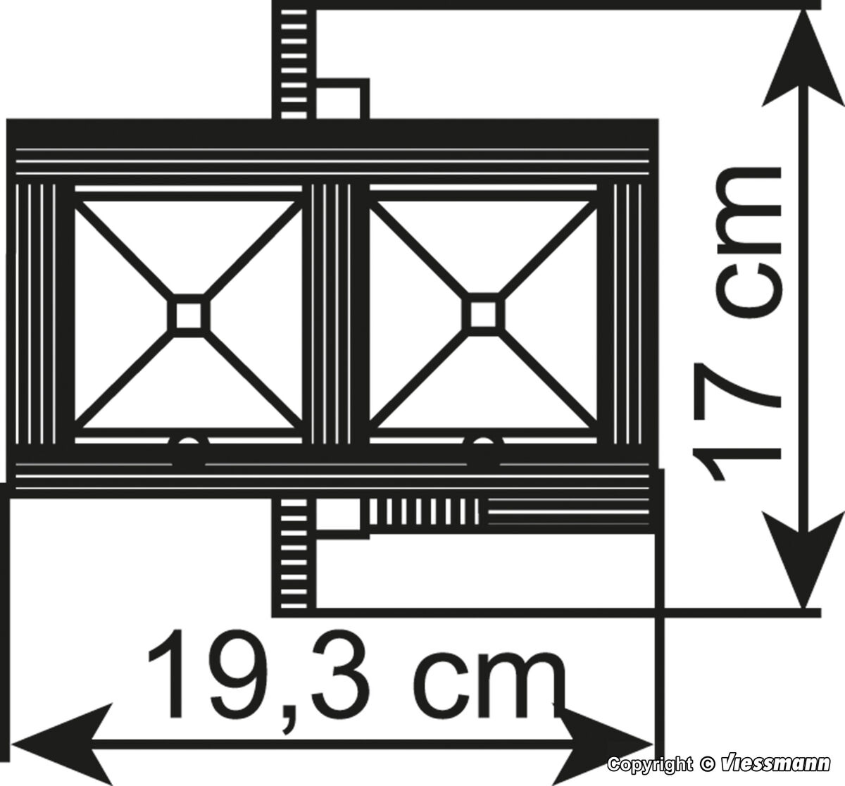 Eine Großbekohlungsanlage war im Zeitalter der Dampflokomotiven im Bahnbetriebswerk unverzichtbar. Noch heute strahlen solche Industriebauten Charme und Anziehungskraft aus. Diese Großbekohlungsanlage hat 2 voneinander unabhängige Kohleabfüllbehälter. Maße: L 19,3 x B 17 x H 13,8 cm / Gleismittenabstand 9,5 cm. Durchfahrtshöhe 6,7 cm / Durchfahrtsbreite 6,8 cm.
