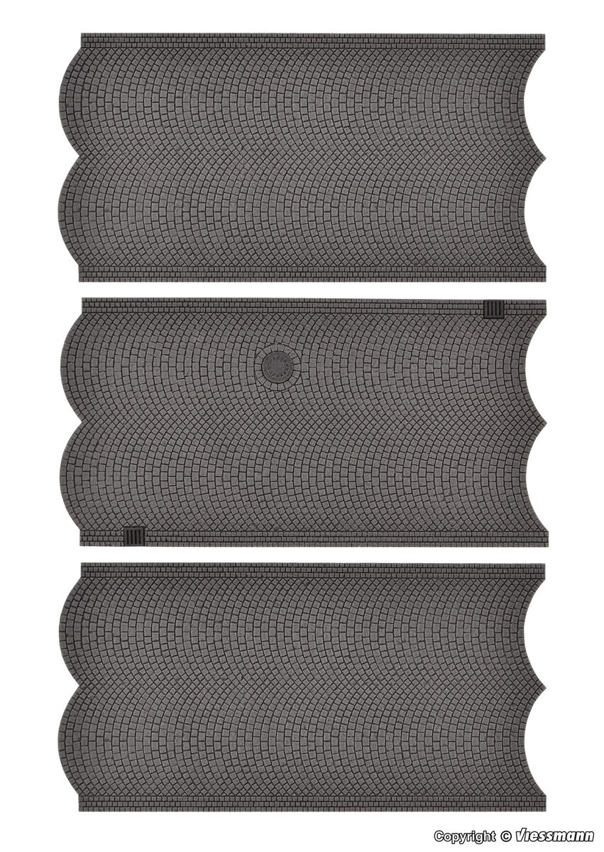 Die Straßenplatten aus der Steinkunst-Serie bestehen aus wetterfestem Sedimentverbundwerkstoff. Dieser Werkstoff erzeugt eine unübertroffen realistische Steinoberfläche. Die Platten sind flexibel und einfach mit einem Cutter-Messer zuschneidbar. Auf einer Platte befinden sich ein Gullideckel und 2 Kanaldeckel, 2 Platten sind ohne Einlage.